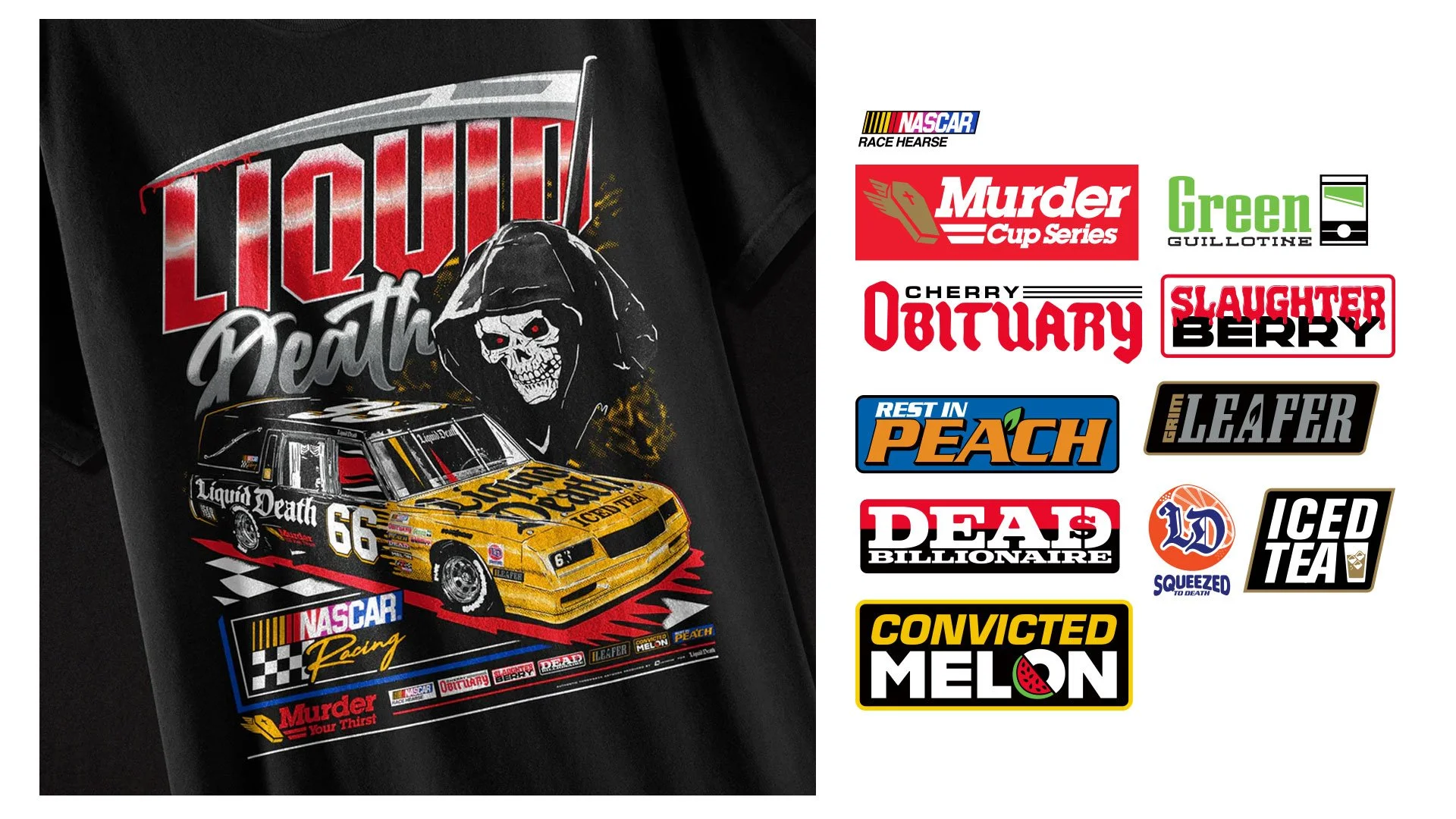 Liquid Death x NASCAR Thirst Hearse Design work and Design Language. Vintage NASCAR Liquid Death Iced Tea and Mountain Water. Liquid Death Racing by LUE Creative. Harris Lue designed Liquid Death.